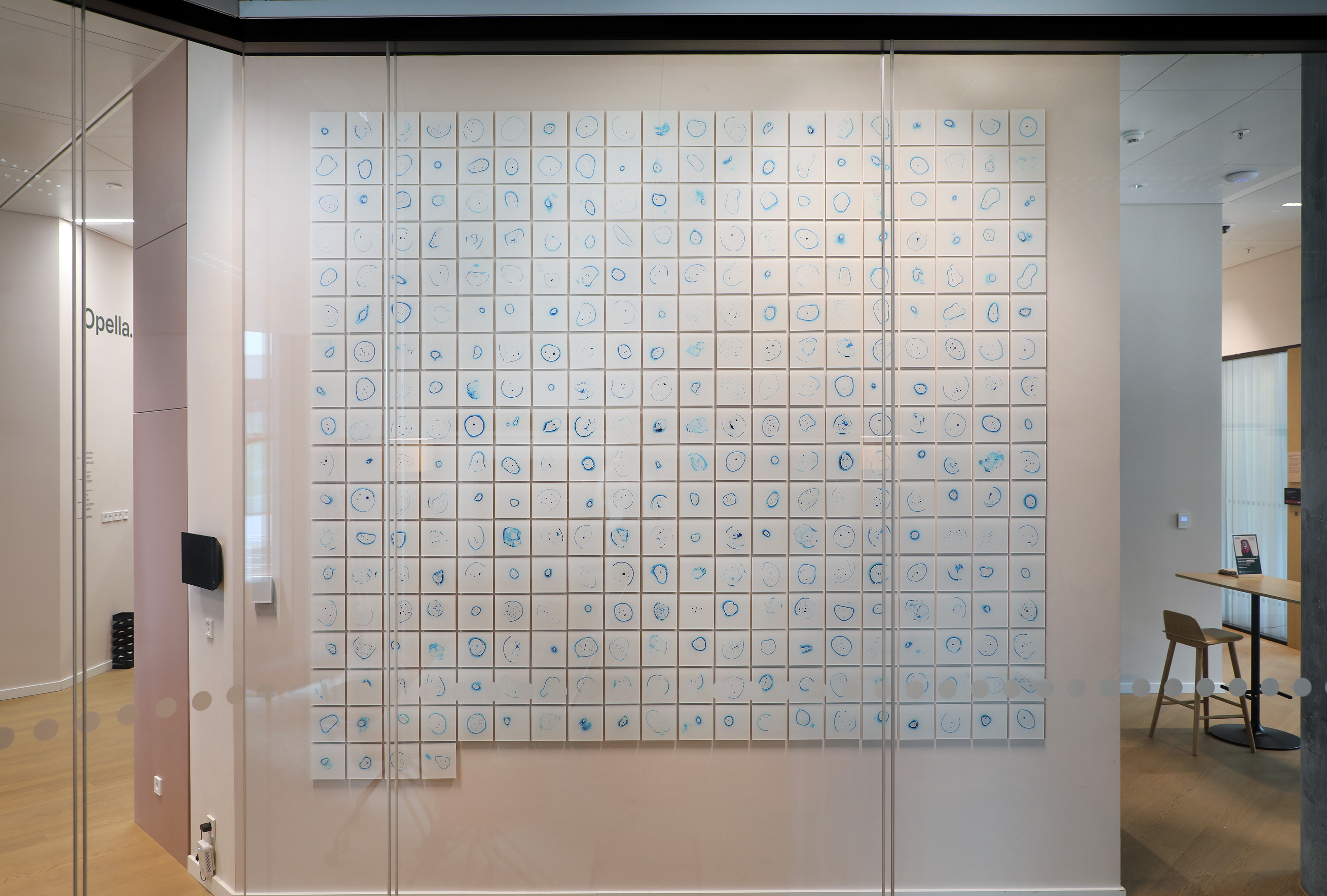 Souvenir Project and Installation for Opella’s Frankfurt office@Aqua Tower Commission work 344 water droplets, plastic container, 50 x 50 mm each 344 acrylic mounted photographs 3190 x 2870 mm 2025 “I have always been drawn to the ambiguity of water. It constantly changes its shape, existing all around us. When we try to scoop it up with our hands, it slips through our fingers—yet its presence is undeniable. In this project, I use watercolor paint to create individual droplets, each encapsulated in laminated film and then photographed. Through this process, the elusive nature of water is rendered into a tangible and certain existence.” This artwork is dedicated to the 344 employees of Sanofi Frankfurt Office. It consists of 344 photographs and 344 droplets. The photographs are displayed on the wall, while the droplets are handed out personally to each employee. The title, 'Asteroids', symbolizes individuality and collectivity, as well as the ambiguity between the two, while offering hope that they can unite as one. Once received, each droplet becomes a vessel of personal memory. It may be displayed like a sculpture on a desk, given to someone else, or quietly forgotten in a drawer. How each employee engages with the piece—how they choose to display, care for, or interpret it, and how it may evolve over time—is entirely entrusted to them.